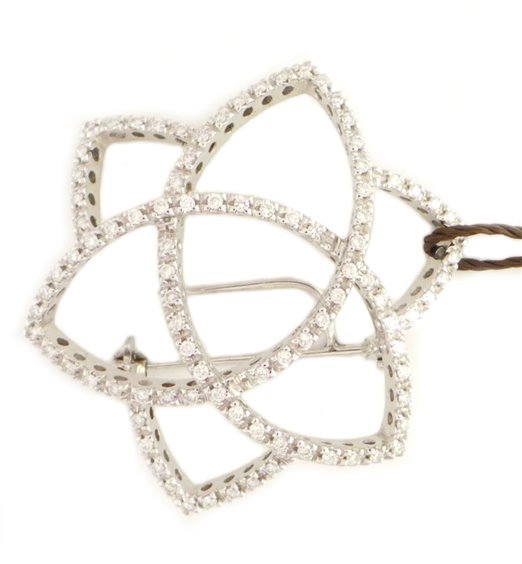 Spilla in oro 18 kt con disegno geometrico gr 12,40 con brillanti caratura totale 0,85 colore G , dimensioni cm 4 . Marca BIBIGI .
