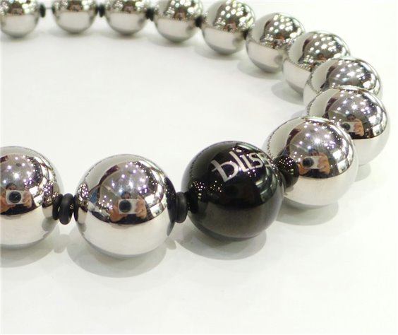 Collana collezione "Big Bowling" in acciaio anallergico a norma di legge misura cm 43 con sfere diametro mm 20, piccolo brillantino su sfera nera, divisori in caucciu' nero e chiusura a cassetta su sfera mm 15. Marca Bliss.