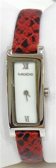 Mode con movimento al quarzo , cassa in acciaio mm 15 x 31 , corona a pressione e fondo wr 3 atm , cinturino in pelle bordeaux . Cinturino rovinato , sara' inserita nella confezione un cinturino in coccodrillo color bordeaux .2 anni di garanzia