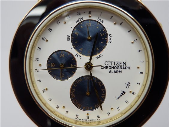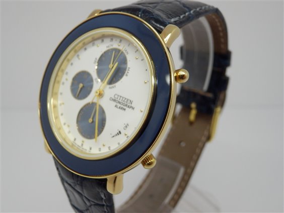 Orologio al quarzo multifunzione crono allarme. cassa dorata con lunetta smaltata in blu come contatori cronografo in contrasto su quadrante bianco. cinturino in coccodrillo blu