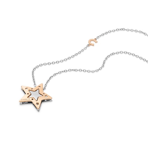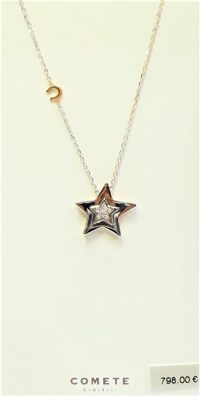 Collana Donna Comete Gioielli collezione Stella - referenza GLB 1447. Girocollo in oro bianco 18 Ct (750‰) con catenina a rolò ovali piccoli, con l'aggiunta dell'iniziale di Comete in oro rosé, ciondolo a forma di stella con diamanti taglio brillante, catena con tre anellini finale per modificare lunghezza (42-44-46). Il ciondolo a forma di stella è lavorato anche al rovescio in oro bianco e rosè. Il ciondolo è formato da due stelle una più grande, con due facce in oro bianco e l'altra rosa, che ne contiene una più piccola, con entrambe le facce in oro bianco ma una impreziosita da diamanti. Diamanti P.Ct. 5 Colore G Purezza SI