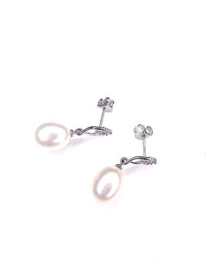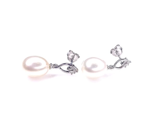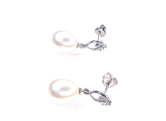 ORECCHINI PENDENTI IN ORO BIANCO 18 KT CON PERLA D'ACQUA DOLCE 10X9 A GOCCIA E DIAMANTI P.CT 4 COL G PUREZZA SI CON PALETTO E FARFALLINE