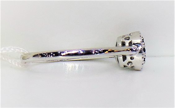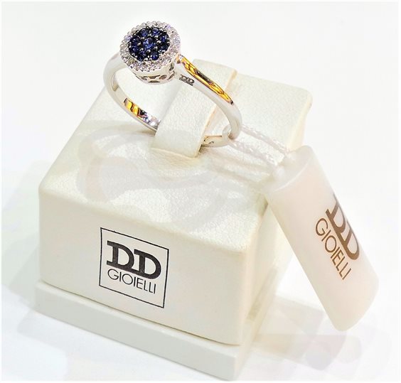 Anello donna oro bianco 18 kt. composto da 1 castone di pavè di zaffiri per kt. 0.15 e contorno di brillanti per kt. 0.10 colore G purezza vs peso gr. 3.1 misura 14.5