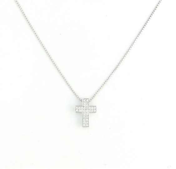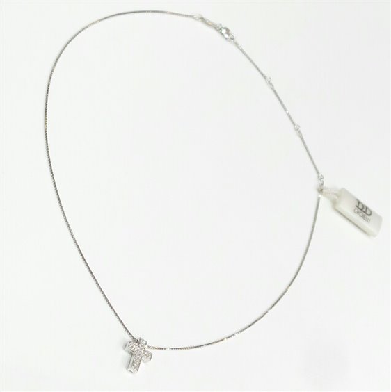 Croce in oro bianco ricoperta di brillanti ct 0,14 col. D su catenina veneziana cm 43,5 con tripla regolazione e moschettone finale . Peso tot. gr 4,5 caratura metallo 750/1000 . Certificato di garanzia Davite e Delucchi