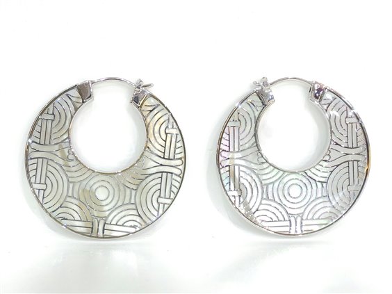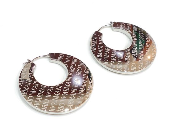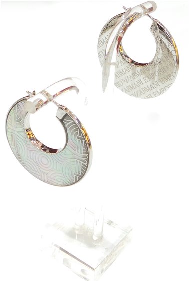 Orecchini in acciaio con impreziosite da disegno in madreperla . Diametro mm 35 . Certificato di garanzia Emporio Armani .