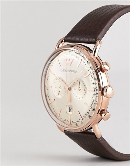 Orologio Cronografo Da Uomo Di Emporio Armani. Modello Con Cassa Rotonda In Acciaio Inossidabile Di Colore Oro Rosè E Finitura Lucida. Cassa Del Diametro Di 43 Mm E Dello Spessore Di 12 Mm. Il Quadrante È Di Colore Grigio Con Vetro Trasparente. Orologio Con Cinturino In Pelle Di Colore Marrone Con Finitura Lucente E Fibbia Ad Ardiglione. La Distanza Delle Anse È Di 22 Mm. Orologio Con Movimento Al Quarzo Con Cronografo E Resistenza All'Acqua Di 5 Atm. La Referenza È Ar11106. Questo cronografo verrà spedito con Scatola Originale Emporio Armani.