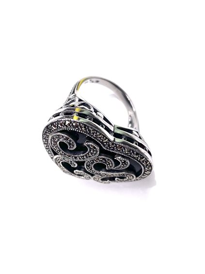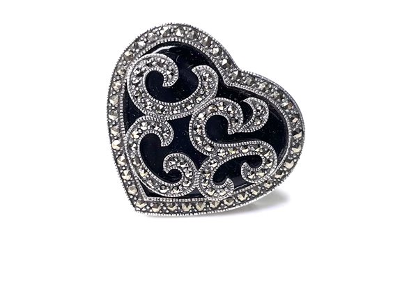 Anello donna in argento 925/000 con cuore impreziosito da smalto nero e decorazione di marcassiti ,mis. 14 .