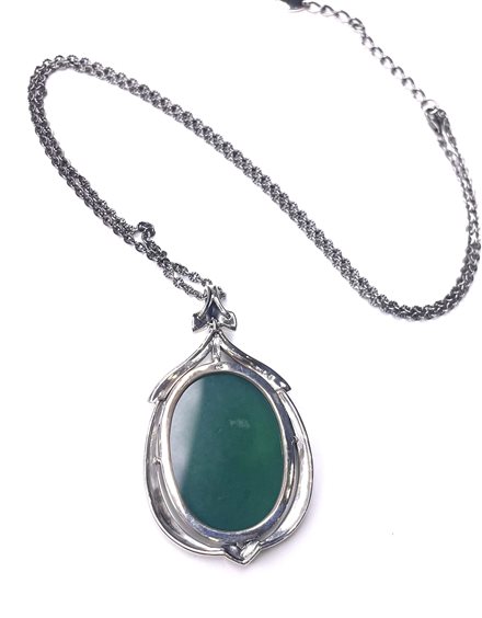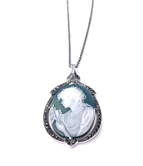 Collana in argento 925/000 cm 65 e cameo pendente tonalità verde contornato da marcassiti .