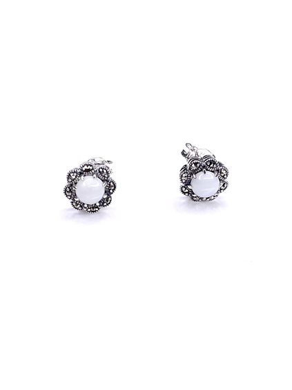 Orecchino a fiore con opale centrale. Marcassiti. Argento 925. Paletto e farfallina