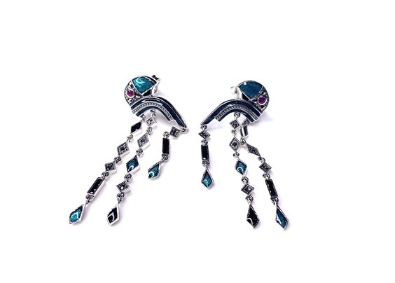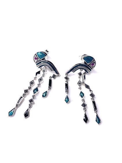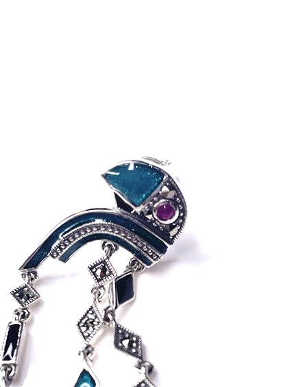Orecchini con pappagallo in argento 925/000 con rubino ,smalto verde e marcassiti ,cm 4.