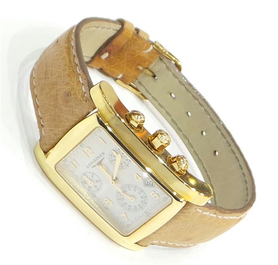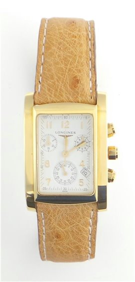 Orologio Longines Dolce Vita al quarzo crono uomo. Cassa in oro giallo 18 carati. Fondo WR 3 atm in oro giallo 18 carati chiuso con 4 viti. Cinturino in vera pelle di struzzo. Quadrante bianco con sfere e numeri arabi dorati. Datario tra il 4 e il 5, secondina al 6 e indicatori crono al 2 e 10. Vetro zaffiro. 2 anni di garanzia