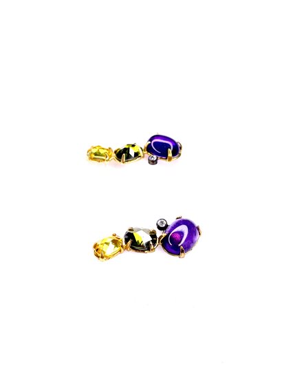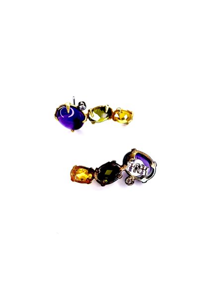 Orecchini con montatura in oro giallo 7501000 , ametista , quarzi e zircone . Lunghezza cm 2,4 . Peso gr 3.6 . Certificato Nomination . Made in Italy N.B. i paletti e le farfalline sono in acciaio .