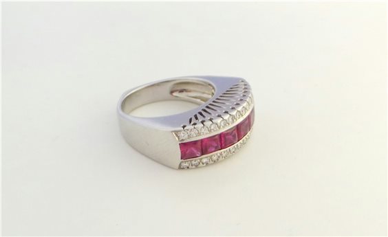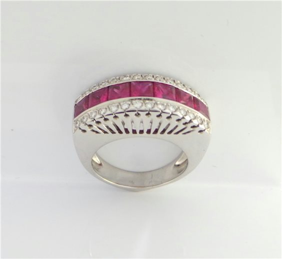 Anello in oro bianco 18 kt con rubini centrali taglio carre' carati 2,24 e diamanti naturali taglio brillante laterali, carati 0,36. Peso gr 12,3 misura 16 e gambo a punta. Prodotto rifinito a mano. Ponte vecchio Gioielli.