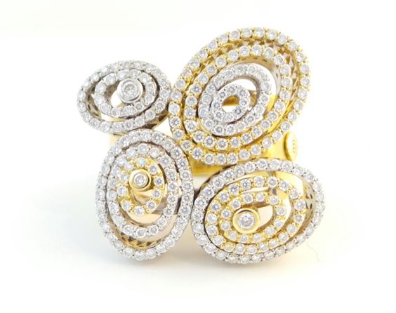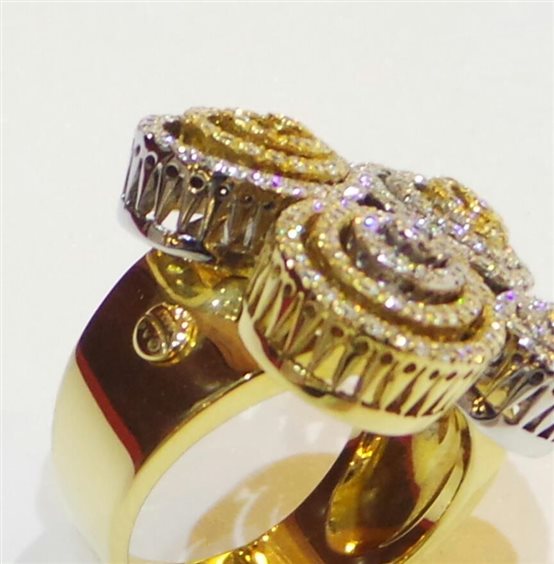 Anello in oro 18 kt con gambo giallo a punta e castoni a spirale bicolor , peso gr19,5 misura 16 e diamanti naturali taglio brillante carati 1,14 . Prodotto rifinito a mano Marca Ponte Vecchio Gioielli.