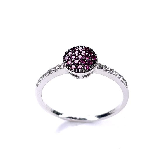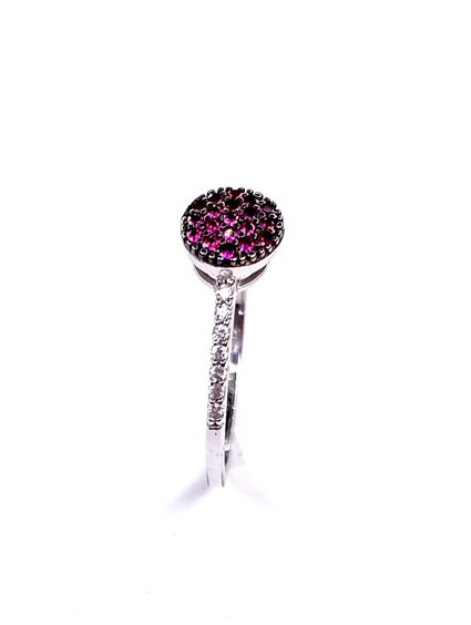 Anello in oro bianco con tondino di zirconi rossi e griffe brunite misura 14 gr.2