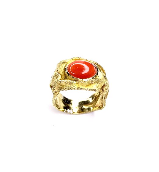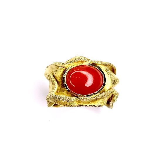 Anello in oro giallo 18 kt con lavorazione sabbiata e diamantata ,corallo taglio cabochon ,gr 10.7 ,misura 14.
