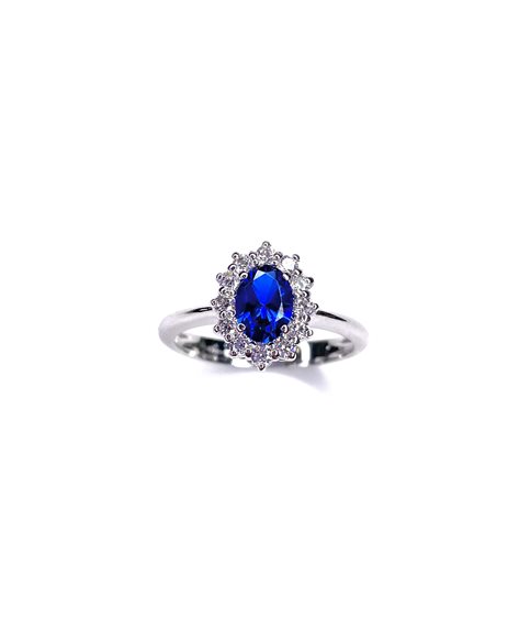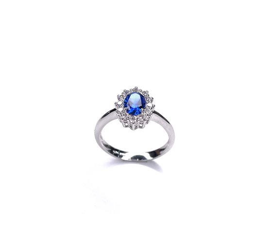 Anello in oro bianco 18 kt con zircone centrale blu e laterali bianchi ,gr 3.24 ,misura 14.