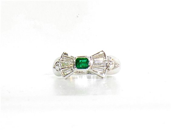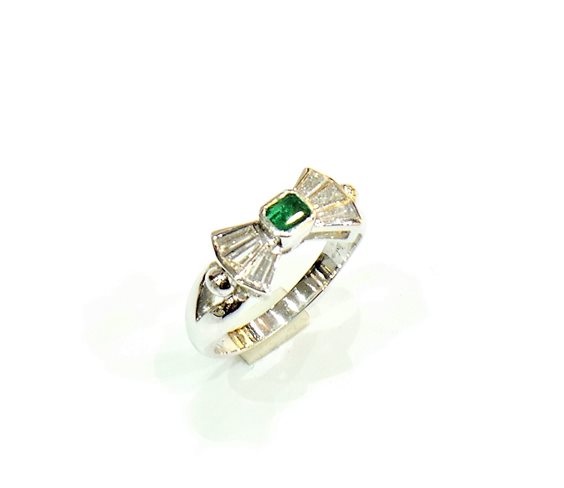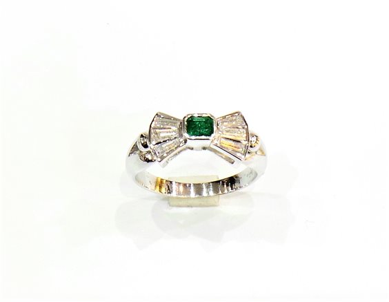 Anello donna fiocco in smeraldo taglio quadro centrale kt 0,15 con 6 brillanti, taglio baguette kt 0,27, colore G, gr 4,3, misura 13