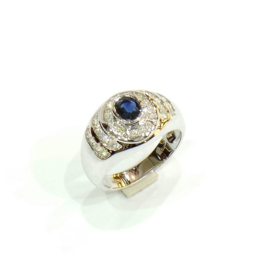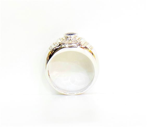 Anello donna in oro bianco con zaffiro blu centrale per kt 0,44, contorno degradante brillanti kt 0,31 colore G, vs purezza, misura 15 e peso gr 6,2