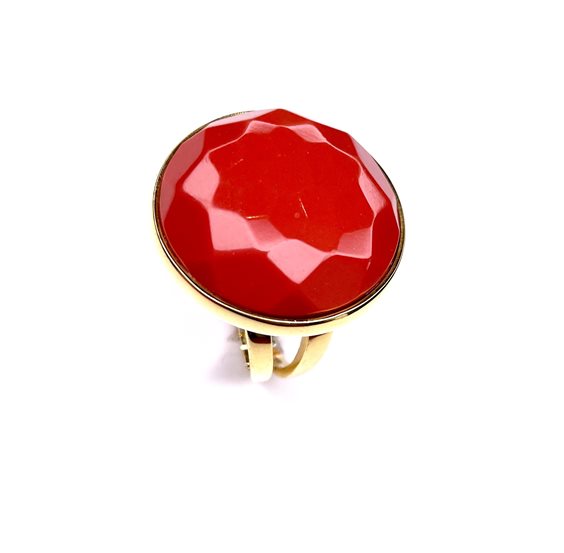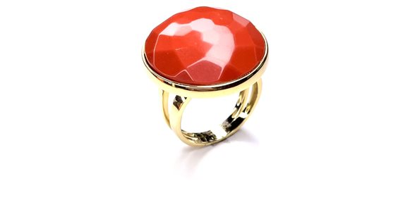 Anello stile moderno in oro giallo 750/1000 gr 14,55 , misura 16 , con corallo sfaccettato taglio cabochon . Certificato d'autenticita' Oreficeria Stocco