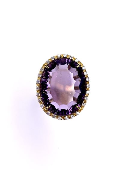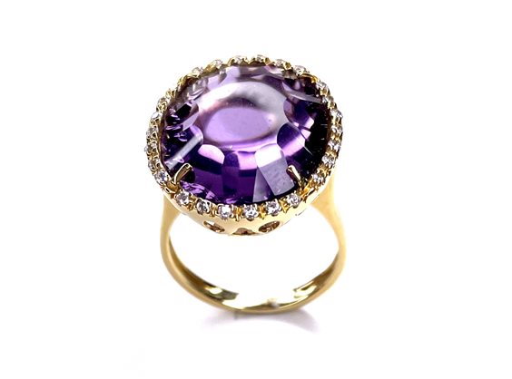 Anello in oro rosa 18 kt con ametista taglio cabochon e contorno di zirconi ,gr 8.9 ,misura 17.