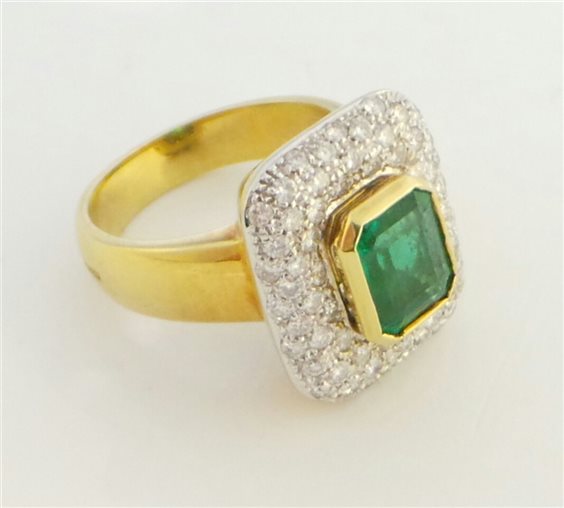 Anello in oro giallo 18 kt peso gr 14,12 misura 16 con smeraldo centrale carati 1,98 e brillanti laterali carati 0,84 . Oreficeria Stocco .
