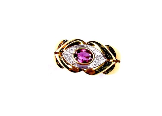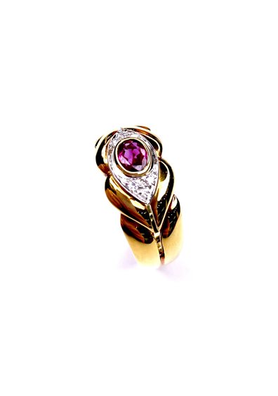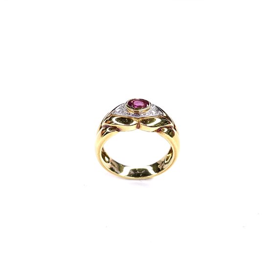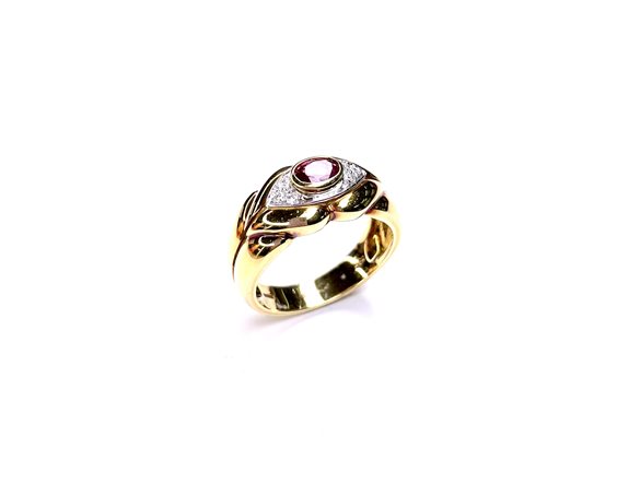 Anello in oro giallo 19 kt con rubino centrale kt 0.37 e diamanti naturali taglio brillante H color ct 0.24 mis 14 gr 7