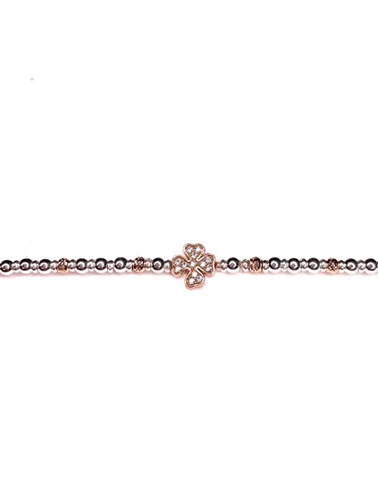 Bracciale donna in argento 925/000 con sfere sfaccettate placcate oro rosa e quadrifoglio con zirconi ,catena finale di regolazione ,cm 20,5