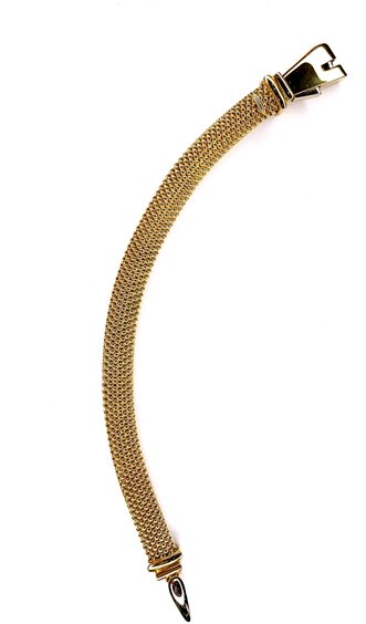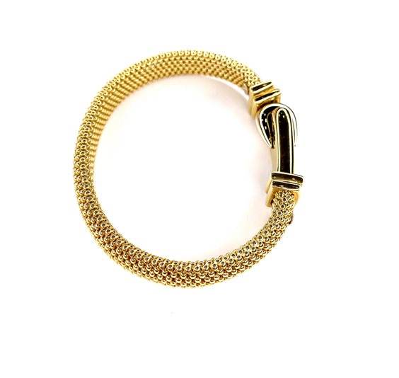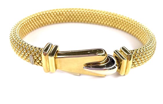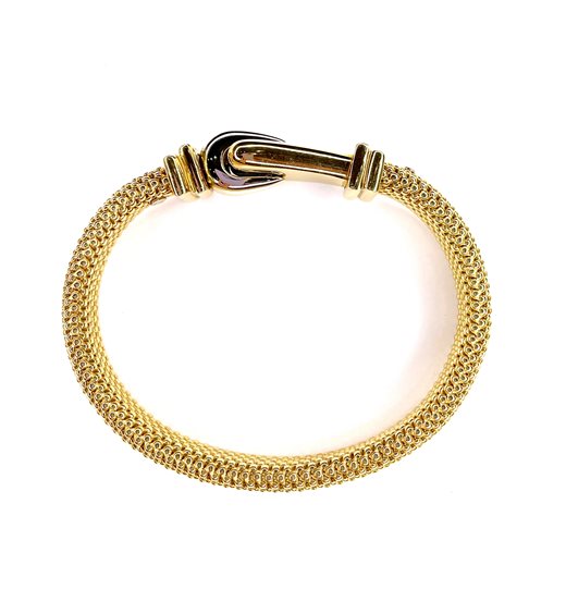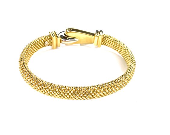 Bracciale Stocco Gioielli in oro giallo 18 kt, gr 46, totale cm 21 e chiusura con moschettone stilizzato ed inserti in oro bianco.