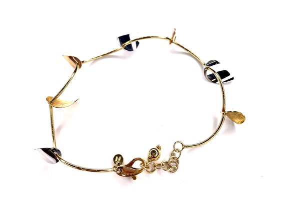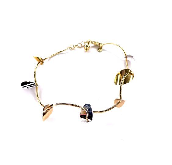 Bracciale in oro 18 kt con i tre colori (giallo-bianco-rosso), gr 8,9 totale lunghezza cm 21,5 formato da graziose foglie stilizzate e tubicini curvi a sezione circolare. Chiusura a moschettone con anellini terminali per messa a misura e piccola sfera finale pendente. Marca Dalla Bona.