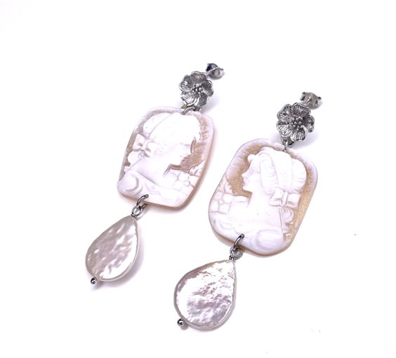 Orecchini in argento 925/000 con dama su conchiglia e perla d'acqua dolce .