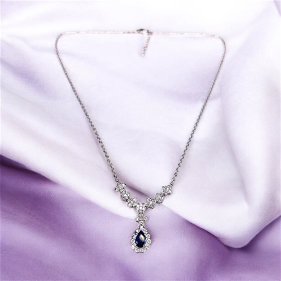 Collana girocollo in argento 925/000 con zirconi bianchi e goccia blu e catena finale di regolazione ,