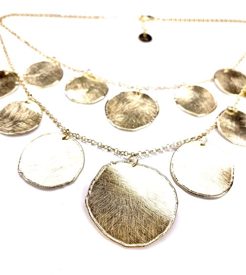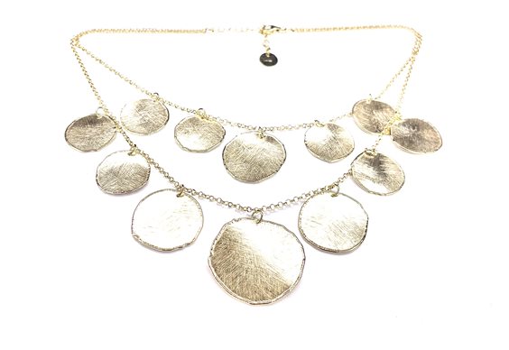 Collana in argento dorato 925/000 con pendenti satinati e doppia catena a scalare cm 40 (la più corta) con anellini di regolazione finale .