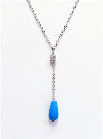Collana girocollo cm 42 in oro bianco 18kt gr 1.6 con pendente cm 3.5 impreziosito da zirconi e goccia con pasta di turchese . Certificato d'autenticità Ambrosia .