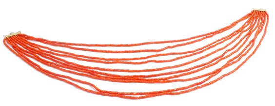 Collana in corallo cilindrico rosso a 10 fili con chiusura in oro giallo e bianco 18 kt in gradazione da cm 39 a cm 50 gr 72.4