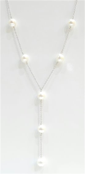 Collana oro bianco 18 kt. con 7 perle di acqua dolce irregolari diametro mm. 11 lunghezza collana cm. 41,5 più cm. 8,5 pezzo pendenta peso gr 15