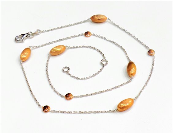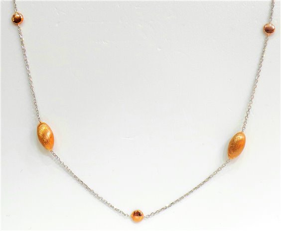 Girocollo donna oro bianco e rosa 18 kt. lavorazione gocce satinate alternate a dischetti lucidi lunghezza cm. 45 peso gr. 5,2