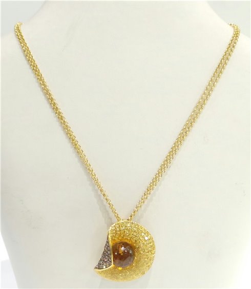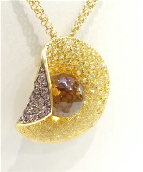 Collier girocollo a due fili con catena rolò in oro giallo 18kt, cm 43, gr 22,4 con pendente in oro giallo impreziosito da zirconi gialli, lavorazione diamantata e sfera centrale sfacettata diametro mm 12 in quarzo color ambra, con risvolto con zirconi bianchi. Chiusura moschettone. Marca Magie Preziose.