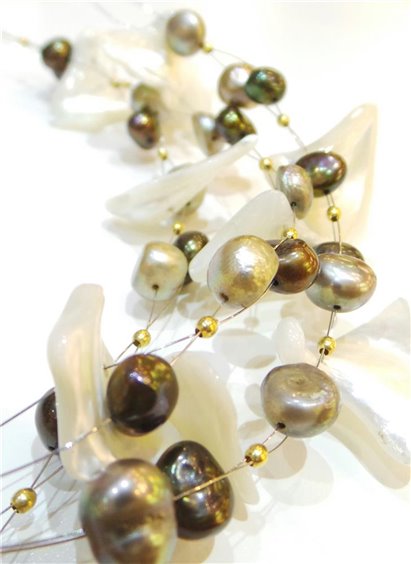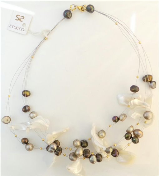 Collier artigianale composto da perle naturali grigie chiare e scure , "conchiglie" di madreperla e piccole sfere in oro giallo 18 carati , il tutto infilato con 6 fili in acciaio . Moschettone in oro . Lunghezza collier 42 cm 19,5 . Stocco Oreficeria .