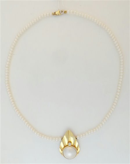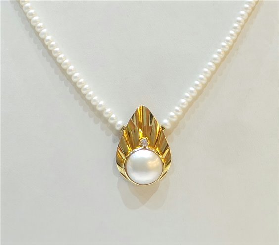 Collana di perle d'acqua dolce, cipollina con chiusura in oro giallo 18 kt e pendente centrale con perla mabè e zircone e contorno in oro 18 kt a forma di goccia. gr 13