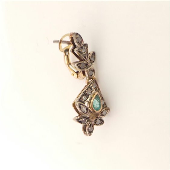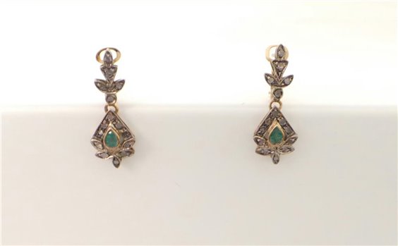 Orecchini pendenti in stile antico in oro giallo 18 kt e argento 925 con diamanti naturali e smeraldi . Peso totale gr 5,40 lunghezza cm 3 e chiusura perno-clips . Oreficeria Stocco .