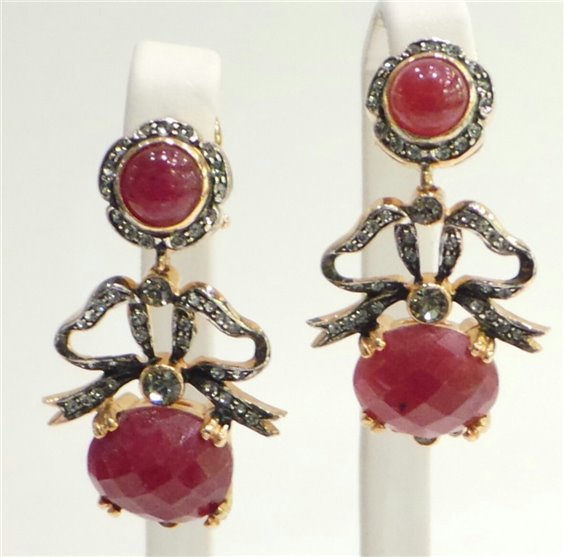 Orecchini in stile antico in argento ramato 925 con radici di rubino e zirconi neri. Lunghezza 3,50cm