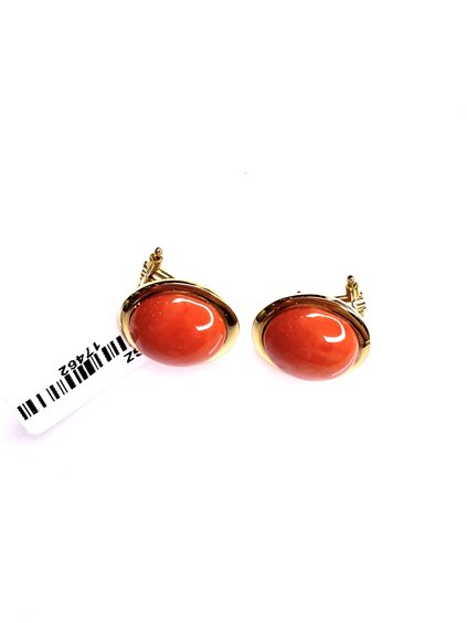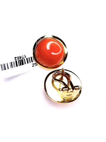 Orecchini Stocco Gioielli in oro giallo 18 K con corallo color salmone diametro mm. 15 attacco perno a clips peso gr. 10,8 .