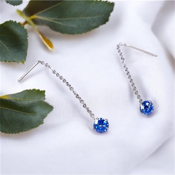 Orecchini con paletto e catenella e zircone azzurro in argento 925/000 ,lunghezza cm 5 .