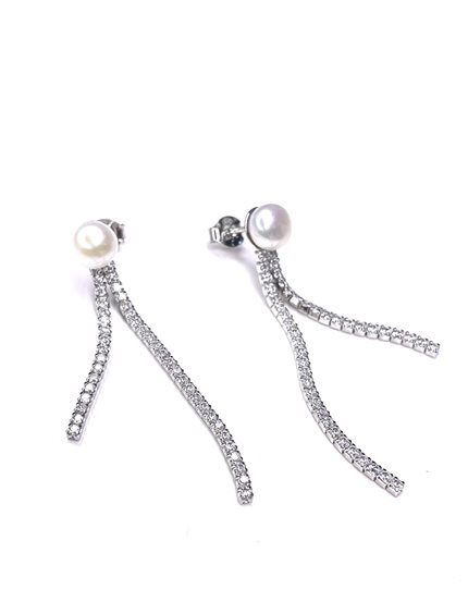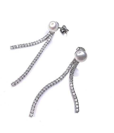 Orecchini pendenti in argento 925/000 con 2 file di zirconi e una perla . Lunghezza cm 5 .