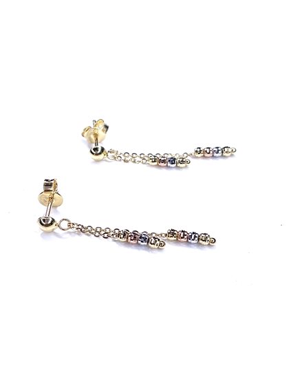 Orecchini pendenti in oro 750/000 a due fili con sfere diamantate a tre colori gr 1.82