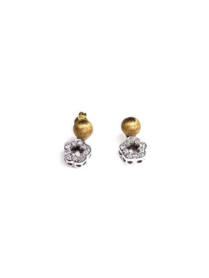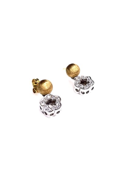 Orecchini Stocco Gioielli in oro 18 k con sfera gialla satinata e pendente a fiore bianco con zirconi ,gr 4.45 .
