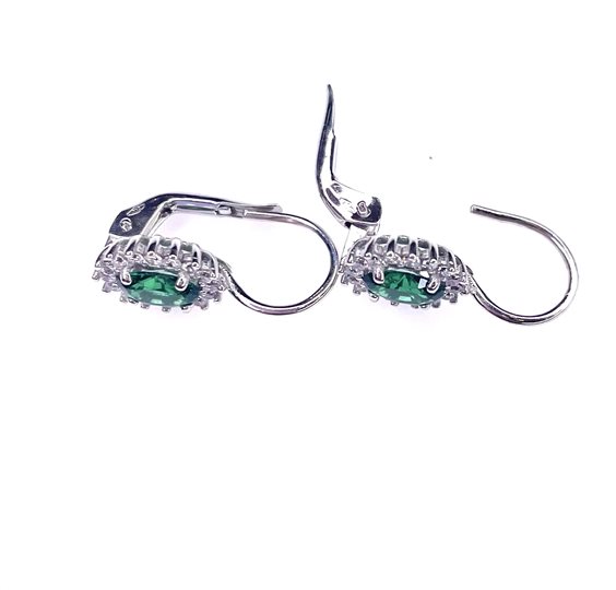 Orecchini in oro bianco 18 kt a monachella con cristallo di colore verde e contorno di zirconi bianchi. Gr.2.46