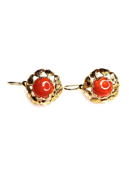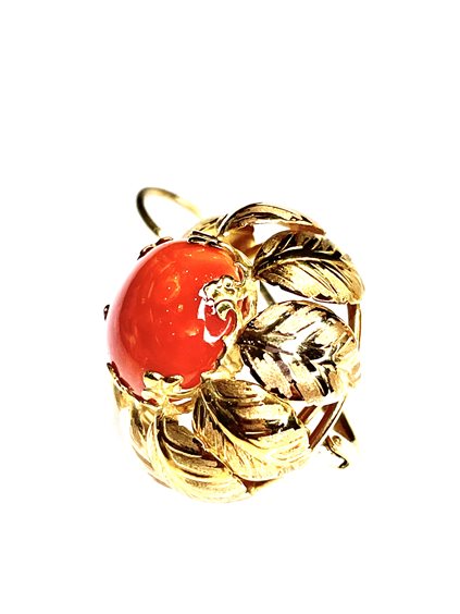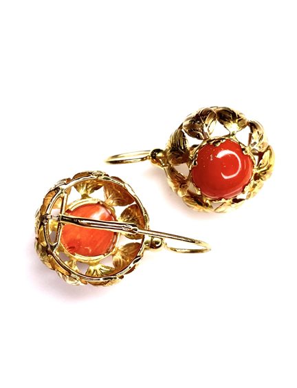 Orecchini Stocco Gioielli in oro giallo 18 K con corallo mediterraneo colore salmone mm.12x12 contorno foglie cesellate chiusura monachella lunghezza cm. 3,4x2,20 peso gr. 11,7 .