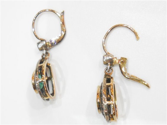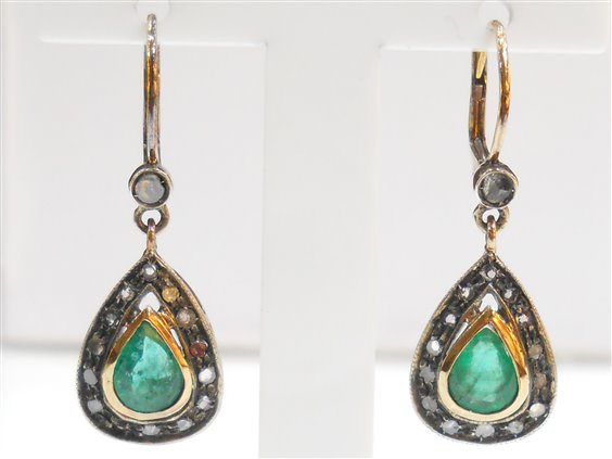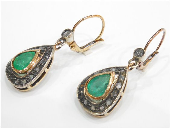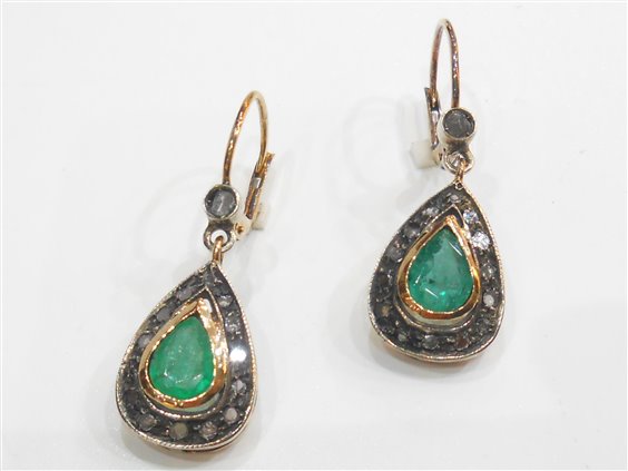 Coppia orecchini oro e argento 800 con smeraldi a goccia per Kt. 2,08 e diamanti per Kt. 0,32 attacco a monachella lunghezza cm. 3,5 peso gr. 7,5